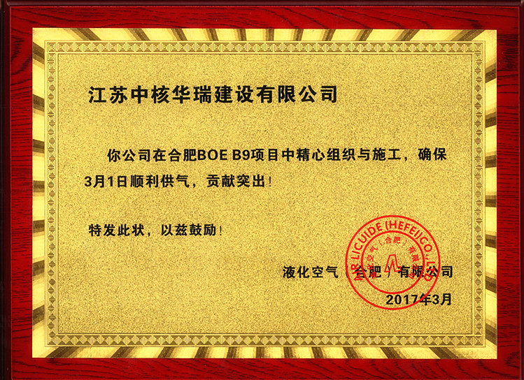 中核华瑞建设有限公司在合肥BOE B9项目中,历经几个月的艰苦奋斗,在工期紧、任务重、要求高、期间还经历春节假期的施工复杂情况下,按时、保质、圆满地完成了项目所要求的各项工作,确保3月1日顺利供气,得到业主嘉奖。