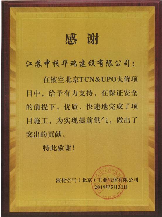中核华瑞在北京TCN&UPO项目中,保质、保量、安全完成施工,为实现提前供气做出贡献,受到业主嘉奖感谢。